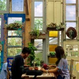 Bagaimana tidak, hampir 90 persen bahan interior, eksterior penghias cafe ini adalah barang bekas. Cafe ini berdiri dengan kayu-kayu bekas sebagai pengganti tembok.