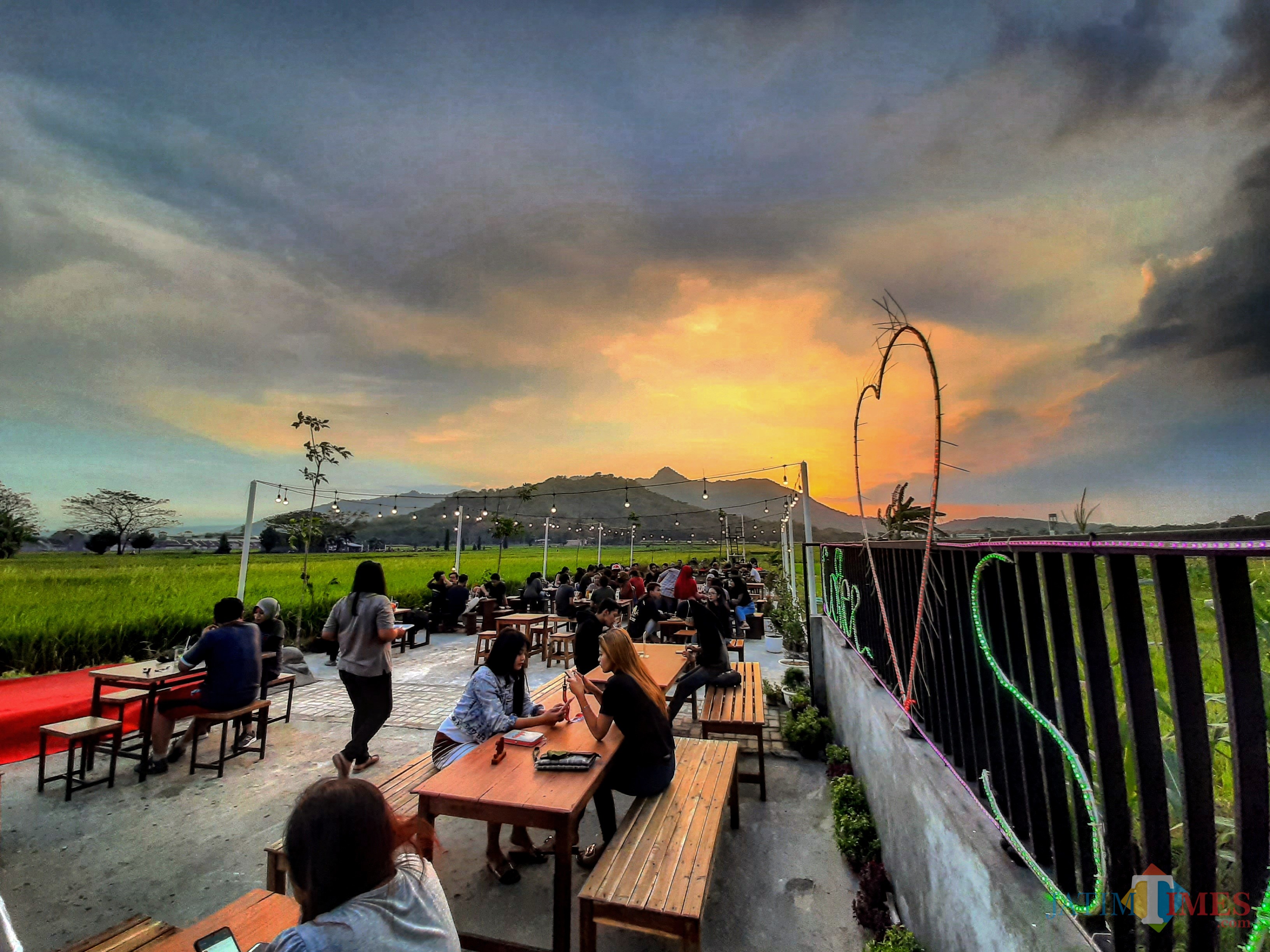 Para pengunjung Kafe SAP menikmati senja sambil menikmati hidangan makanan dan minuman. (eko arif s/Jatimtimes)